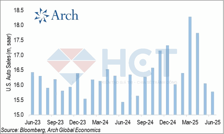 Doanh số bán ô tô tại Mỹ đã tăng mạnh trước “ngày Giải phóng”, nhưng sau đó giảm mạnh, cho thấy sự tăng trưởng này chủ yếu là do hành vi mua hàng trước. Việc giảm mạnh trong doanh số phản ánh sự chững lại trong nhu cầu sau khi các đợt mua hàng trước đã hoàn tất, điều này có thể khiến giá ô tô gặp khó khăn trong việc duy trì mức cao.