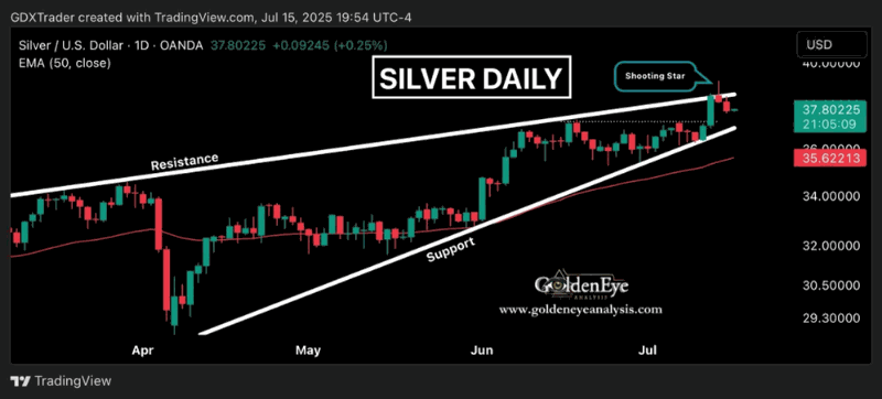 Giá bạc hình thành một nến shooting star tại kháng cự của mô hình nến tăng, xác nhận sự đảo chiều giảm giá. Giá hiện tại ở giữa mô hình và có khả năng sẽ tiếp tục đi ngang. Cần chờ đợi sự phá vỡ rõ ràng các mức hỗ trợ hoặc kháng cự để xác nhận hướng đi tiếp theo.