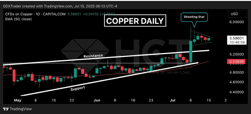 Giá đồng hiện đang đi trong phạm vi mô hình tam giác. Nến shooting star cho thấy sự suy yếu trong đà tăng và có khả năng đồng sẽ tiếp tục đi ngang hoặc điều chỉnh. Tuy nhiên, phe mua vẫn đang bảo vệ mức hỗ trợ và nếu giá phá vỡ mô hình tam giác, xu hướng tăng sẽ tiếp diễn.