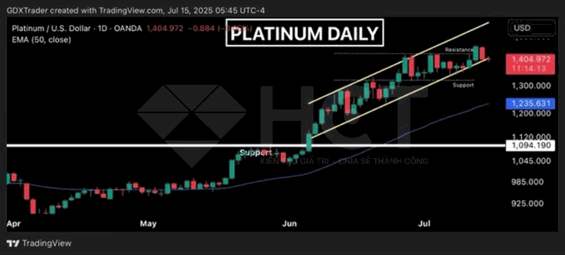 Giá bạch kim vẫn đang trong xu hướng tăng mặc dù xuất hiện các tín hiệu giảm giá. Nến doji hôm qua cho thấy phe bán không đủ mạnh để thay đổi xu hướng. Phe mua vẫn kiểm soát cho đến khi hỗ trợ quan trọng bị phá vỡ.
