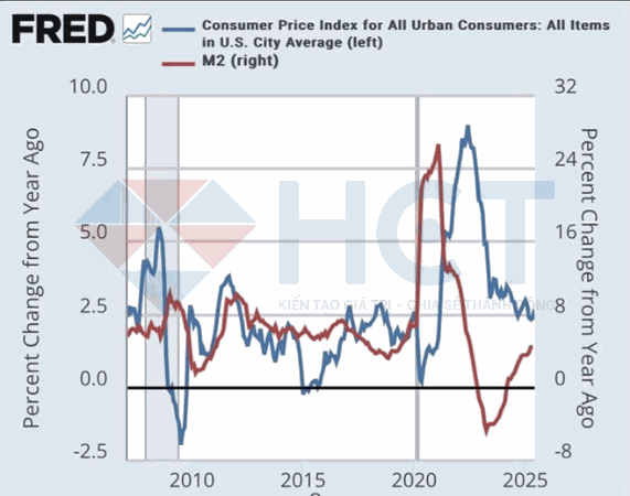 Báo cáo CPI tháng 6 cho thấy lạm phát đang tăng trở lại. Dữ liệu cung tiền M2 đang có xu hướng tăng trở lại và dẫn dắt CPI trước khoảng 18 tháng. Điều này làm dấy lên lo ngại rằng một làn sóng lạm phát mới đang đến gần, khi áp lực giá tiêu dùng bắt đầu phản ánh đà tăng của cung tiền trước đó. Dữ liệu này cho thấy Fed khó có khả năng cắt lãi suất trong tháng 7.