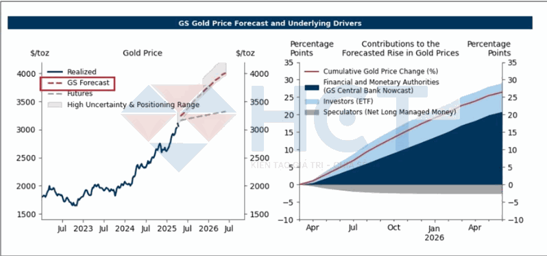 Theo dự báo từ Goldman Sachs, giá vàng có thể đạt 4.000 USD/ounce vào giữa năm 2026. Dự báo này được hỗ trợ bởi các yếu tố như chính sách tài chính và tiền tệ của các ngân hàng trung ương, cũng như sự tham gia của nhà đầu tư (ETF) và các nhà đầu cơ.