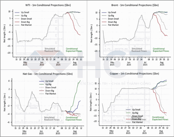 Trong khi đó, dầu thô (WTI và Brent) và đồng có thể gặp rủi ro giảm giá mạnh nếu xu hướng giảm bắt đầu, bởi dòng vốn CTA có thể khiến giá giảm nhanh chóng.