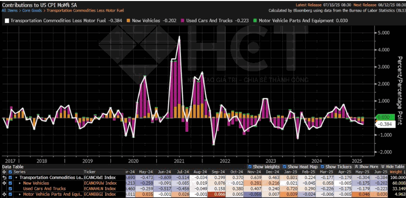 Biểu đồ CPI lõi cho thấy, mặc dù có sự gia tăng lạm phát ở các sản phẩm bị ảnh hưởng bởi thuế quan, nhưng lạm phát tổng thể đã giảm. CPI lõi tháng 6 chỉ đạt 0,23%, dù lạm phát ở các mặt hàng bị ảnh hưởng bởi thuế quan có xu hướng tăng, và trung bình CPI lõi trong 3 tháng gần đây chỉ dưới 0,2% mỗi tháng. Áp lực giảm từ giá ô tô đã giúp giảm bớt một phần đáng kể mức tăng giá của các sản phẩm bị ảnh hưởng bởi thuế quan.