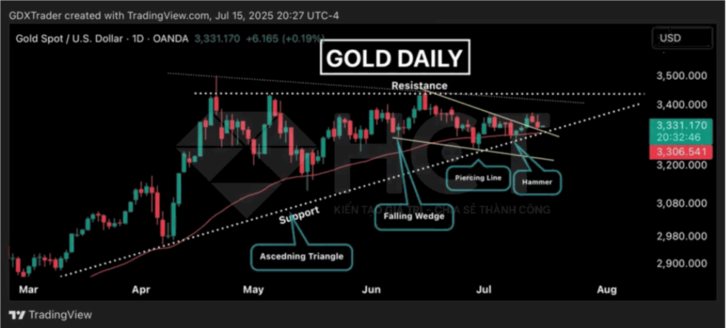 Giá vàng giảm nhẹ gần 0.5%, do đồng đô la mạnh lên. Giá vàng đang kiểm tra lại vùng hỗ trợ quan trọng sau khi phá vỡ mức kháng cự. Phe mua vẫn kiểm soát nhưng cần giữ vũng vùng hỗ trợ hiện tại để duy trì xu hướng tăng.
