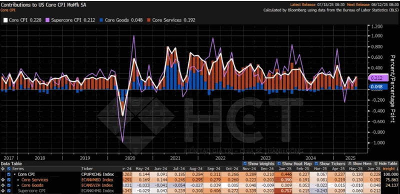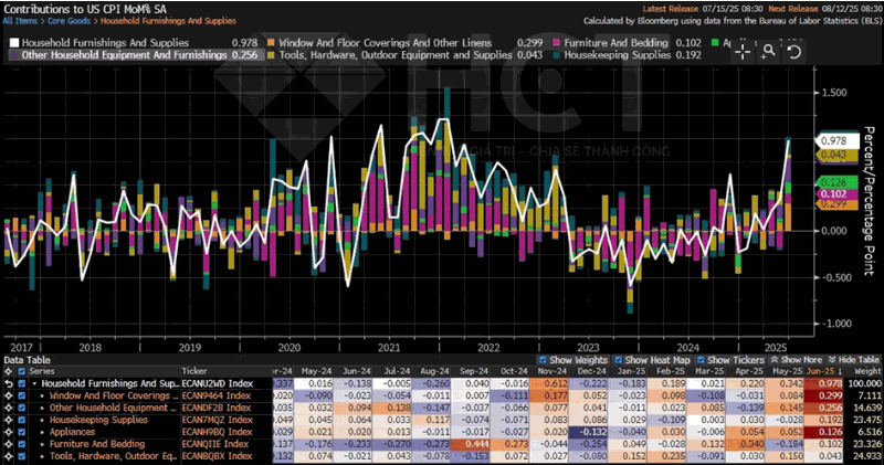 CPI tháng 6 cho thấy áp lực lạm phát đang gia tăng ở những nhóm sản phẩm chịu ảnh hưởng lớn từ thuế quan. Ví dụ, nhóm Đồ gia dụng tăng giá gần 1% trong tháng 6, đánh dấu mức tăng mạnh nhất kể từ đỉnh điểm của lạm phát do đại dịch vào đầu năm 2022. Điều này chỉ ra rằng mặc dù có những tuyên bố về "không có dấu hiệu lạm phát" từ thuế quan, nhưng áp lực lạm phát vẫn rõ ràng tồn tại trong các nhóm hàng hóa bị ảnh hưởng bởi chính sách.