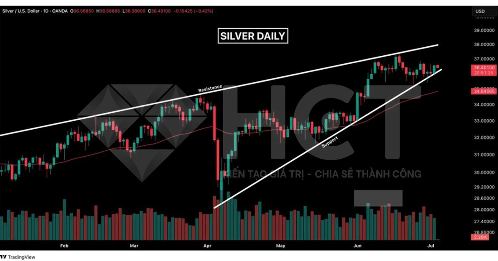 Giá bạc hiện vẫn giữ được hỗ trợ trong mô hình nêm tăng, nhưng đồng thời xuất hiện khả năng hình thành mô hình nêm. Nếu mô hình này bị phá vỡ xuống bên dưới, lực bán có thể tăng mạnh trong ngắn hạn.