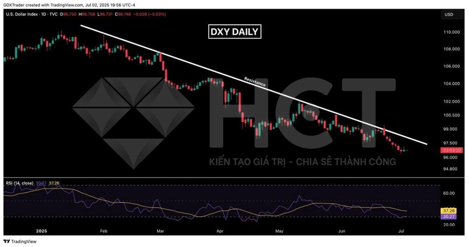 DXY cố gắng phục hồi nhưng thất bại, cho thấy đà tăng yếu và áp lực bán vẫn chiếm ưu thế. Giá vẫn bị chặn dưới đường xu hướng giảm. Nếu không vượt được ngưỡng kháng cự này một cách rõ ràng, các nhịp tăng chỉ là phục hồi kỹ thuật ngắn hạn.