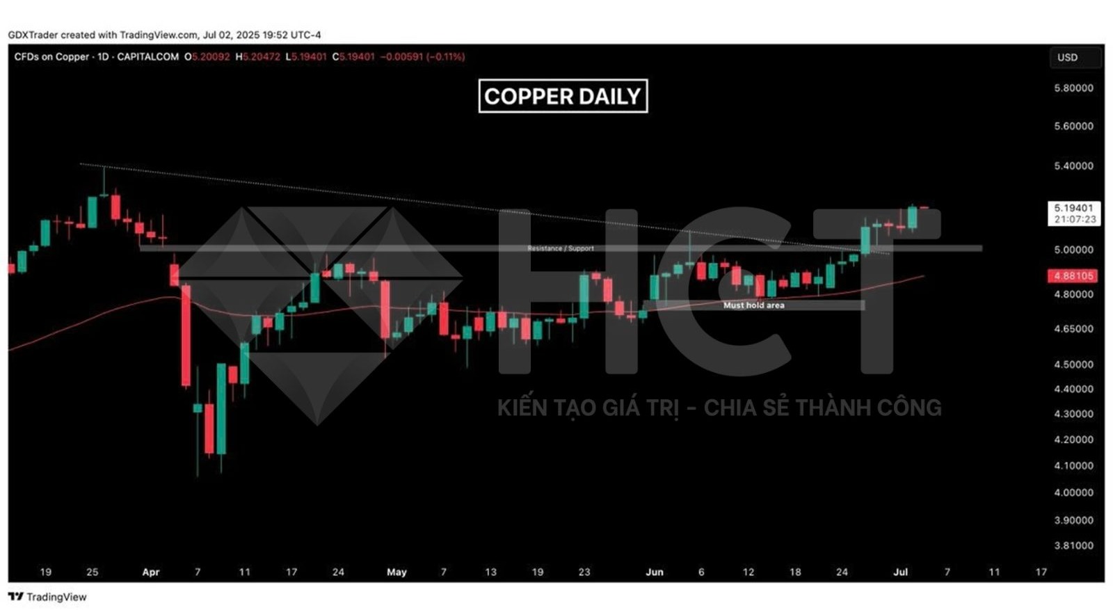 Giá đồng đã vượt khỏi vùng tích lũy đi ngang trước đó, cho thấy xu hướng tăng đang quay trở lại. Cây nến tăng hôm qua xác nhận động lượng tiếp diễn, đặc biệt sau khi giá bứt phá khỏi ngưỡng tâm lý quan trọng $5.00. Miễn là giá giữ được trên vùng breakout, xu hướng chính vẫn nghiêng về chiều tăng.