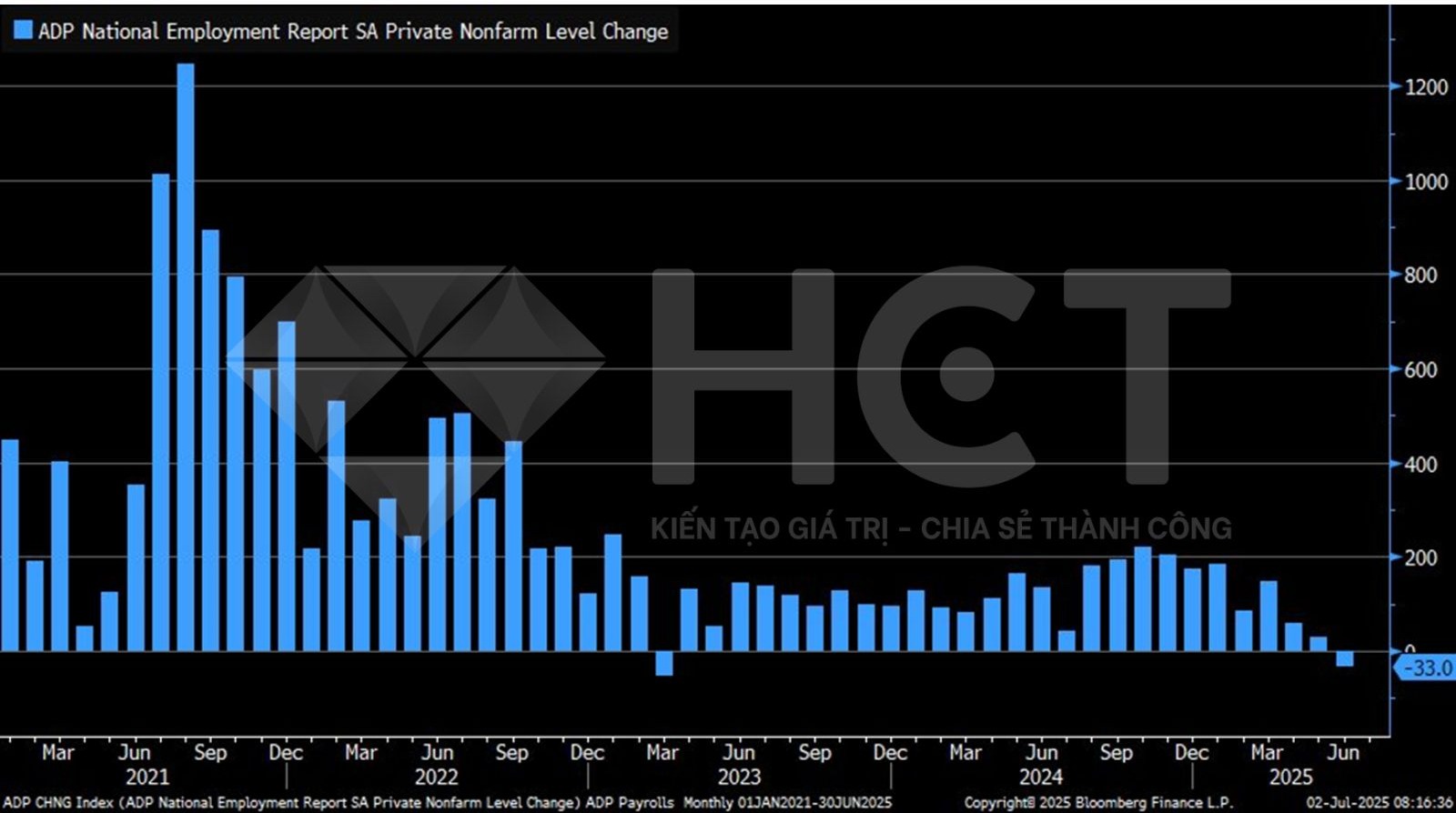Dữ liệu ADP tháng 6 ghi nhận số việc làm khu vực tư nhân giảm 33.000 – thấp hơn rất nhiều so với kỳ vọng tăng 98.000 và là mức giảm đầu tiên kể từ tháng 3/2023.