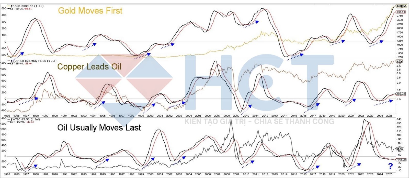 Biểu đồ cho thấy quy luật luân chuyển thường thấy: vàng tăng trước, sau đó đến đồng, và dầu đi sau cùng. Hiện tại, vàng và đồng đều đã cho tín hiệu phục hồi rõ ràng, trong khi dầu vẫn đang trong trạng thái tích lũy, cho thấy khả năng dầu sẽ là mặt hàng tiếp theo trong chu kỳ tăng của thị trường hàng hóa.