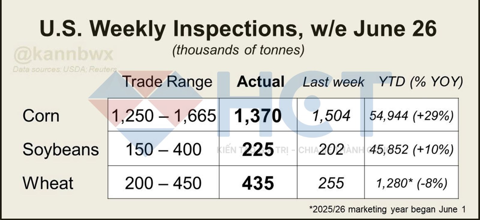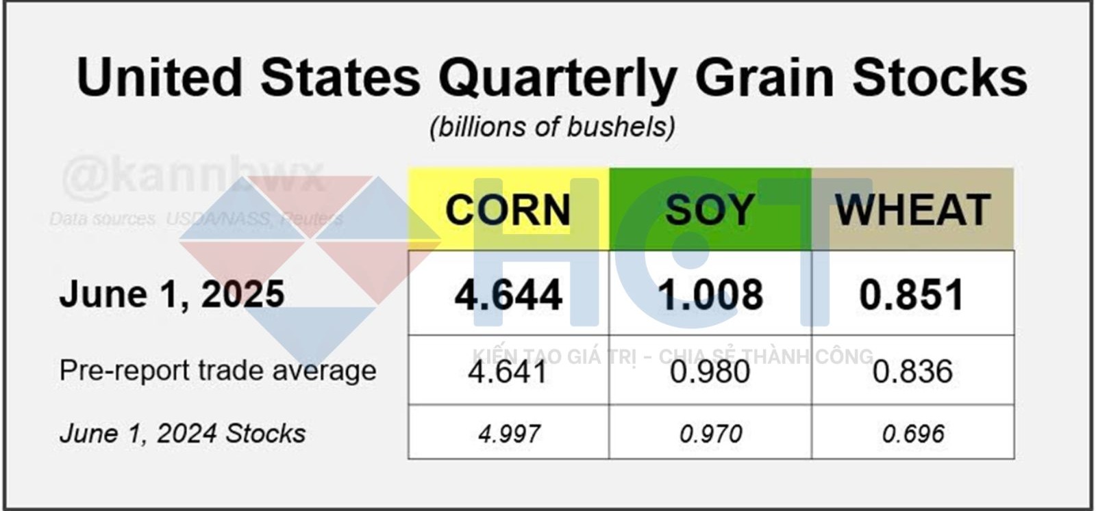 4. Tồn kho ngô của Mỹ tính đến ngày 1/6 gần như trùng khớp với dự báo. Tồn kho đậu tương và lúa mì cao hơn dự kiến một chút.