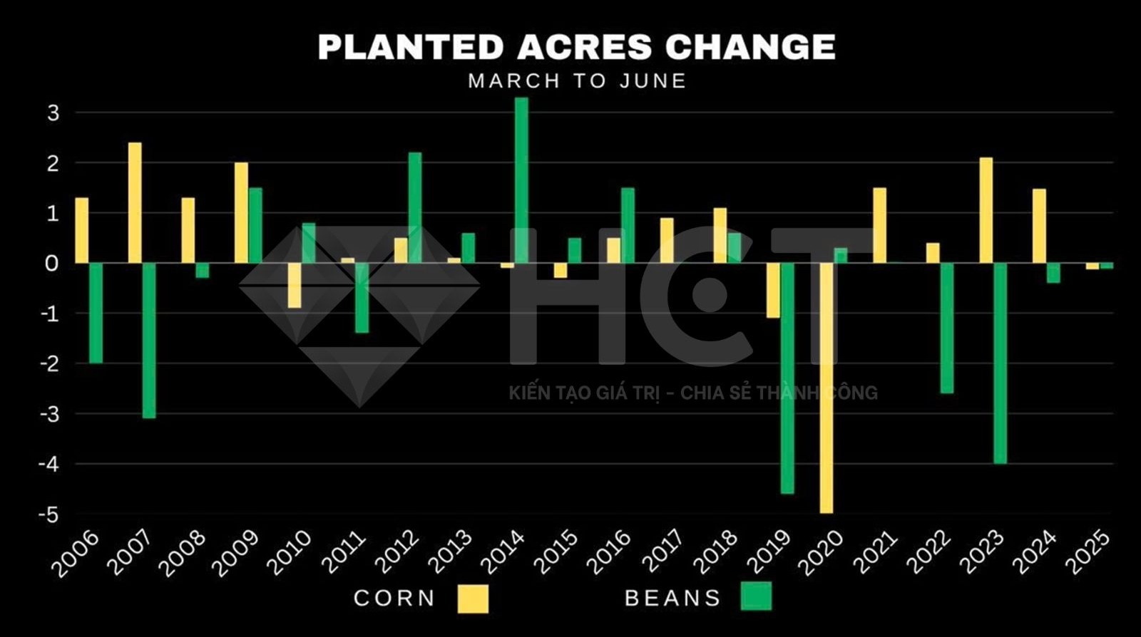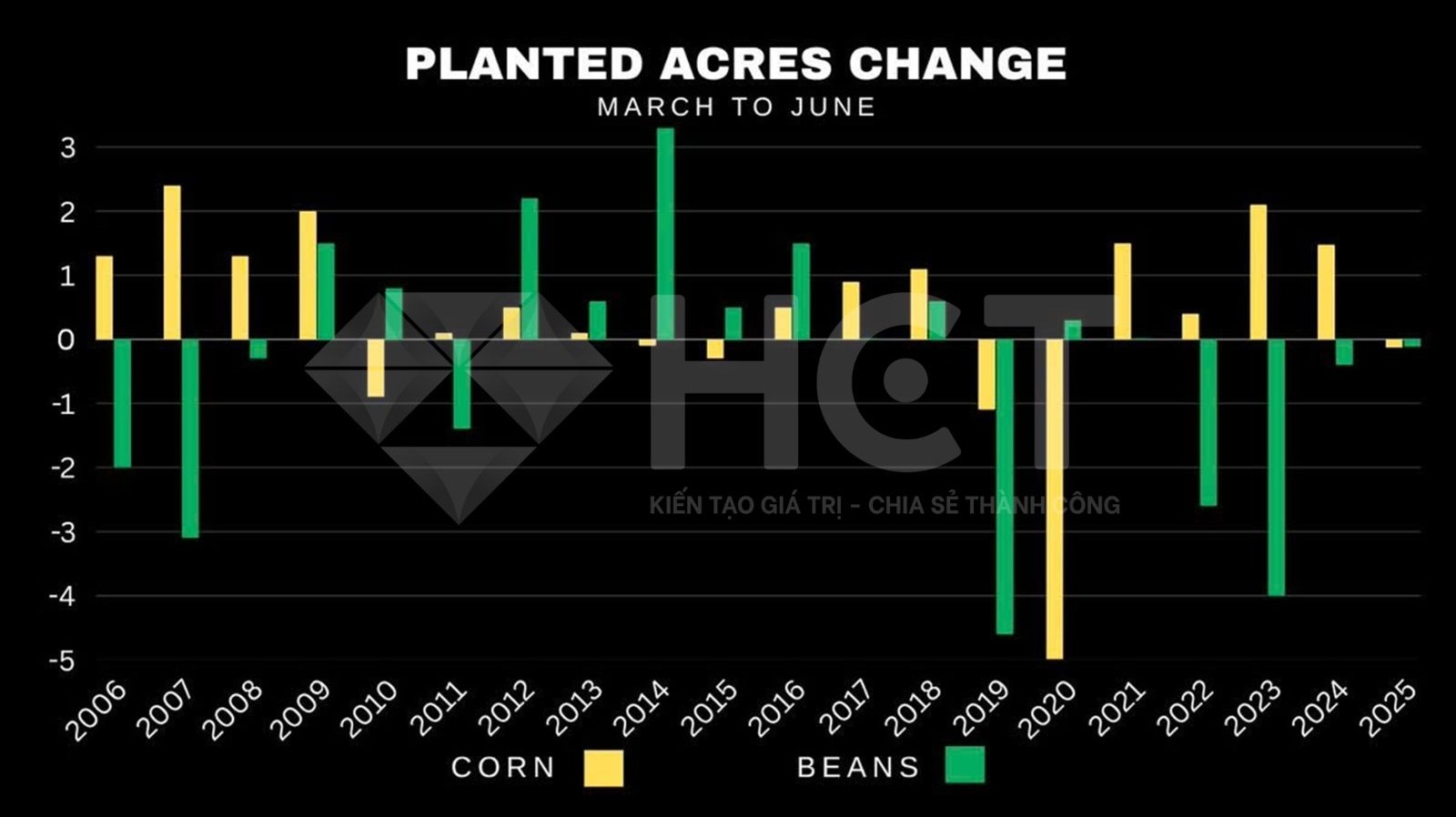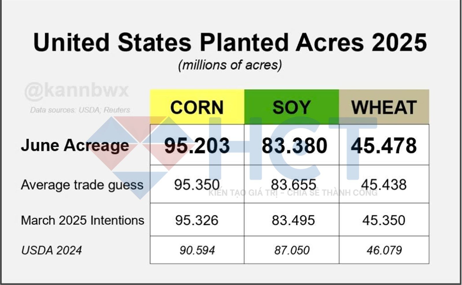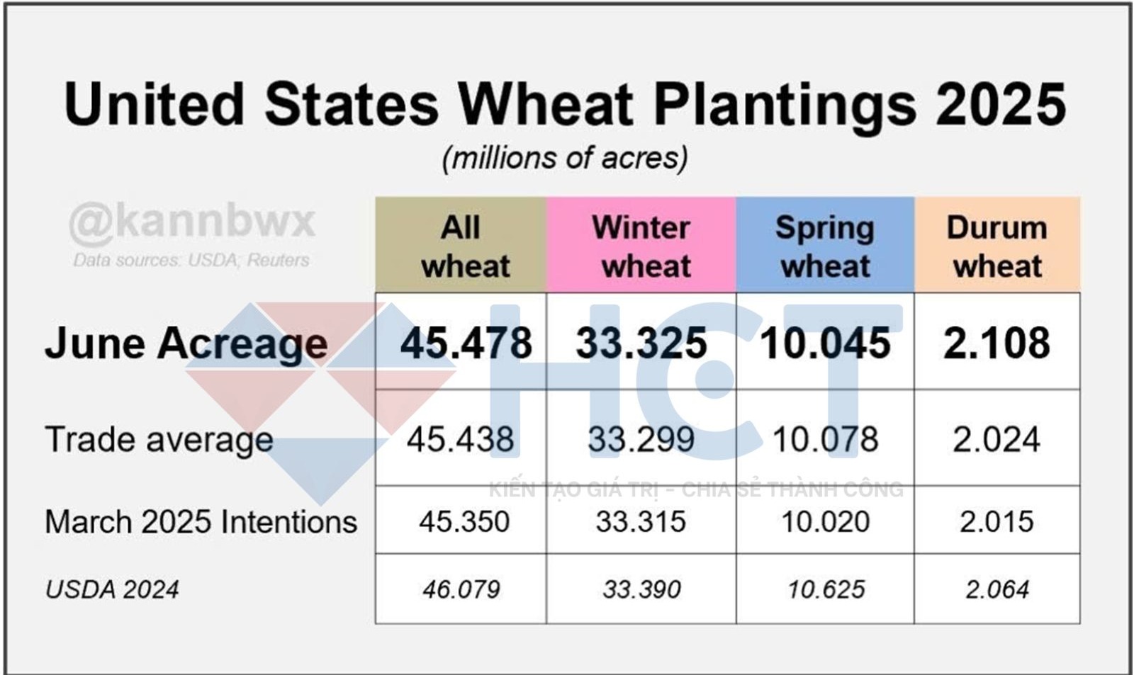 1. Diện tích gieo trồng lúa mì xuân tại Mỹ năm nay cao hơn so với dự báo hồi tháng Ba, nhưng vẫn giảm nhẹ so với kỳ vọng trung bình của thị trường. Dù vậy, đây vẫn là mức thấp nhất trong 55 năm qua.