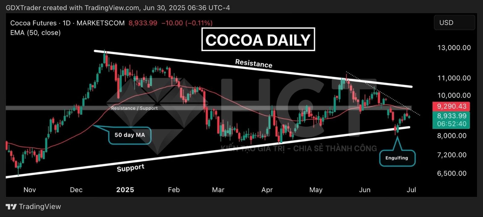 1. Giá ca cao thứ Hai tăng nhẹ với cây nến tiếp diễn, nhưng vẫn bị kìm giữa các ngưỡng kháng cự quan trọng gồm kháng cự ngang, đường xu hướng giảm và đường trung bình 50 ngày tất cả hội tụ quanh trung điểm của mô hình tam giác đối xứng. Giá giữ trên đường hỗ trợ, nhưng biên độ hẹp cho thấy thị trường đang tích lũy, chưa rõ xu hướng. Hiện chưa có tín hiệu mới, nhưng với những ai đã vào lệnh từ nhịp bật lên tuần trước, vị thế vẫn ổn. Để xu hướng tăng rõ ràng, cần một cú bứt phá khỏi vùng kháng cự.