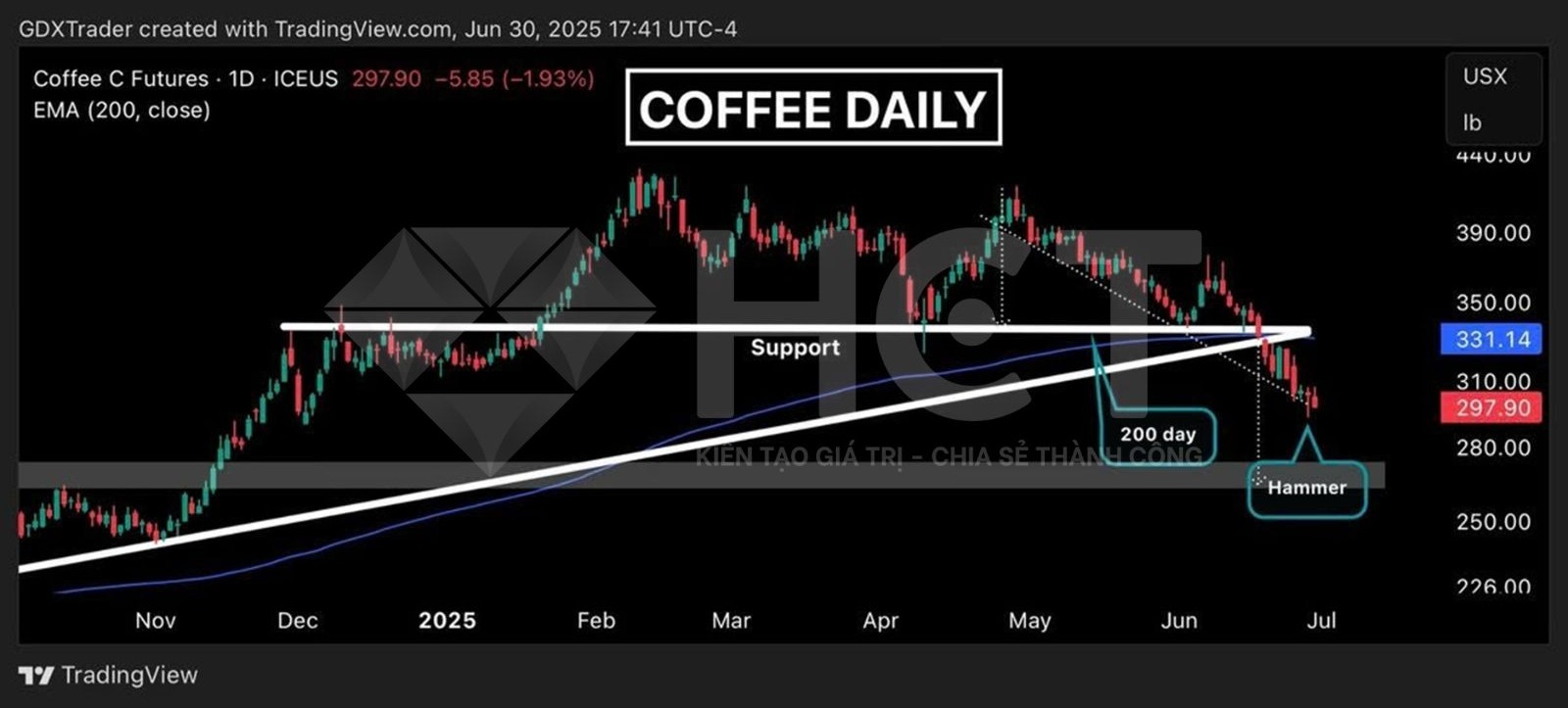 2. Phiên thứ Sáu, giá cà phê tạo mô hình nến hammer với bóng dưới dài, cho thấy lực mua xuất hiện mạnh để bảo vệ vùng hỗ trợ và kéo giá đóng cửa gần mức cao nhất. Dù hammer thường là tín hiệu đảo chiều mạnh, nhưng nến này vẫn hình thành với đỉnh thấp hơn và đáy thấp hơn, cho thấy xu hướng lớn vẫn do phe bán kiểm soát.