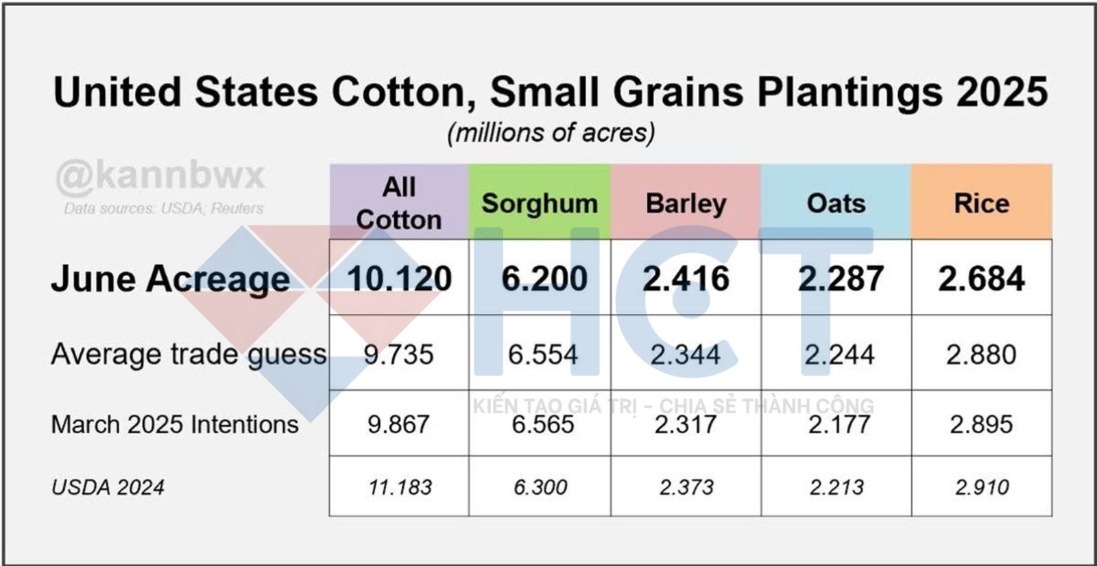 2. Diện tích gieo trồng bông tại Mỹ vượt tất cả các dự báo của thị trường, trong khi diện tích trồng cao lương lại thấp hơn mọi ước tính.