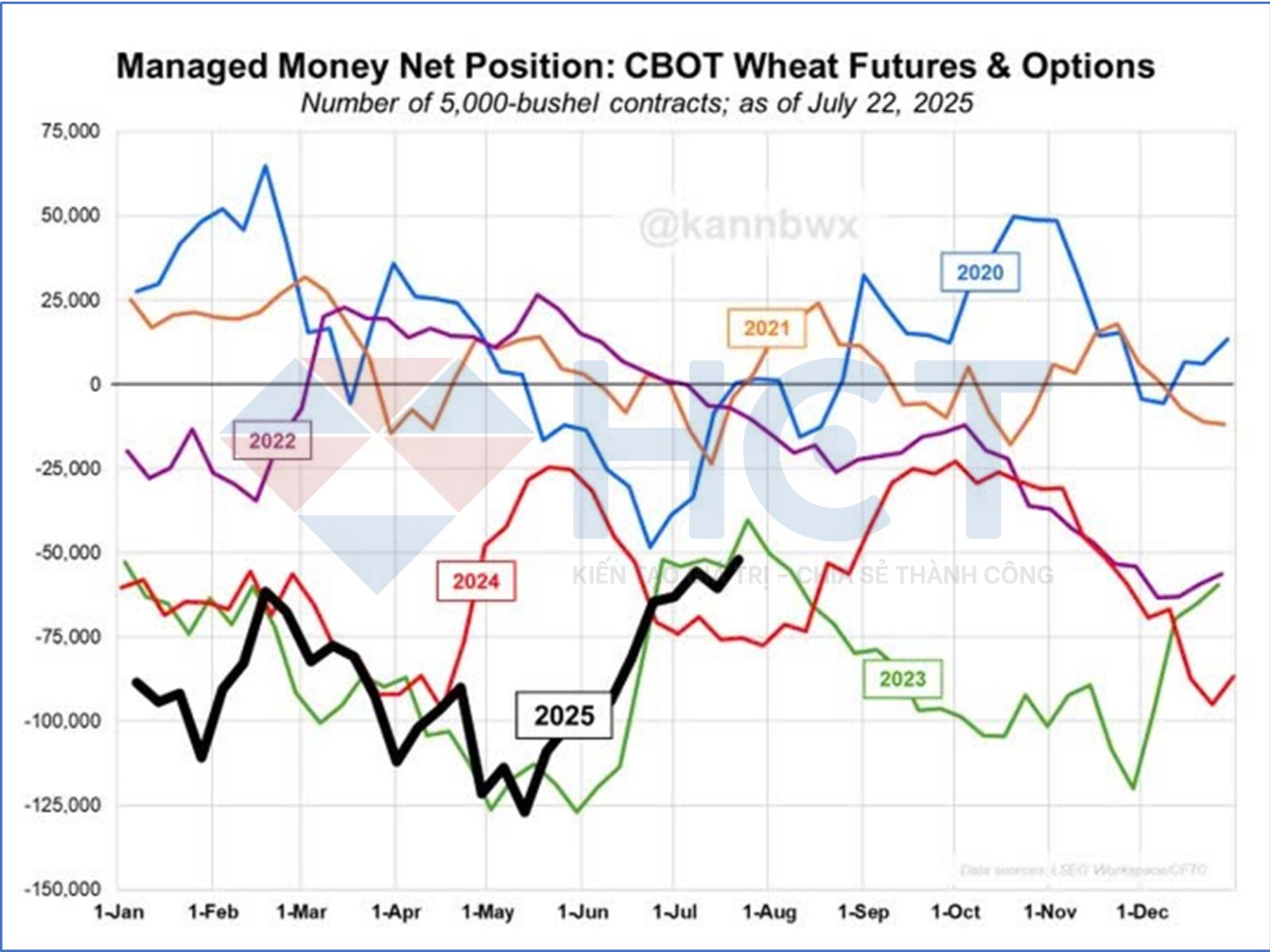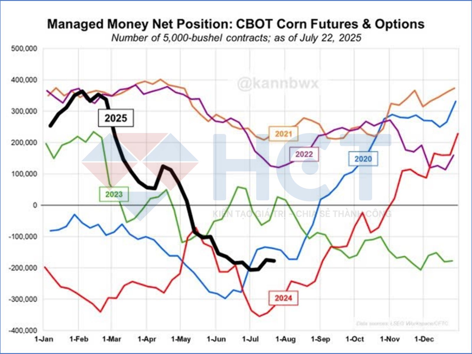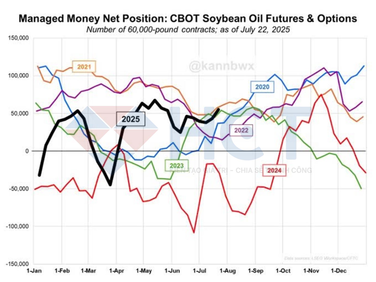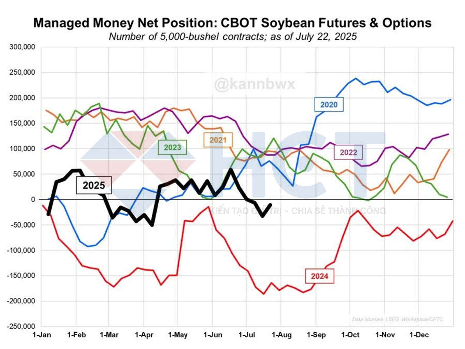 2. Tính đến ngày 22/7/2025, các quỹ đầu cơ trên sàn CBOT đã thu hẹp vị thế bán đối với đậu tương, tiến gần đến trạng thái trung lập nhưng vẫn còn nghiêng nhẹ về xu hướng giảm. Trong khi đó, khô đậu tương tiếp tục bị bán mạnh, gần mức kỷ lục. Ngược lại, dầu đậu tương đang ghi nhận tâm lý tích cực từ các quỹ, tương tự xu hướng trong năm 2021 và 2023.