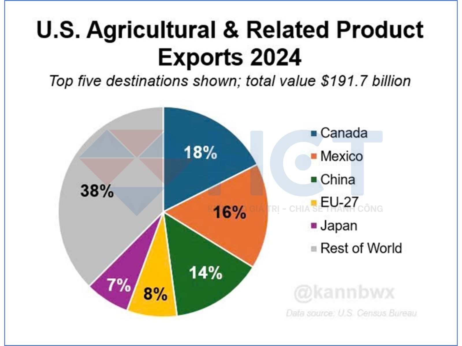4. Mỹ và Liên minh châu Âu vừa đạt được một thỏa thuận khung thương mại vào Chủ Nhật, trong đó bao gồm mức thuế 15% đối với hàng hóa từ EU và cam kết EU sẽ tăng cường nhập khẩu một số sản phẩm nhất định từ Mỹ. Cựu Tổng thống Donald Trump nhận định thỏa thuận này sẽ mang lại “tác động lớn” cho ngành nông nghiệp, tuy nhiên chi tiết cụ thể vẫn chưa được công bố. Năm 2024, các nước EU là thị trường xuất khẩu nông sản lớn thứ tư của Mỹ.