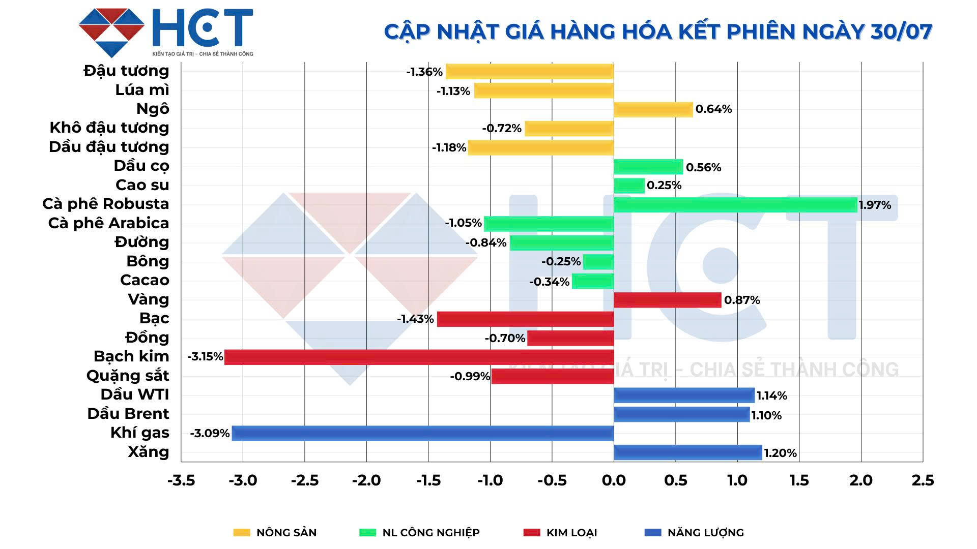 Biến động giá một số loại hàng hóa quan trọng kết phiên ngày 30/7/2025: