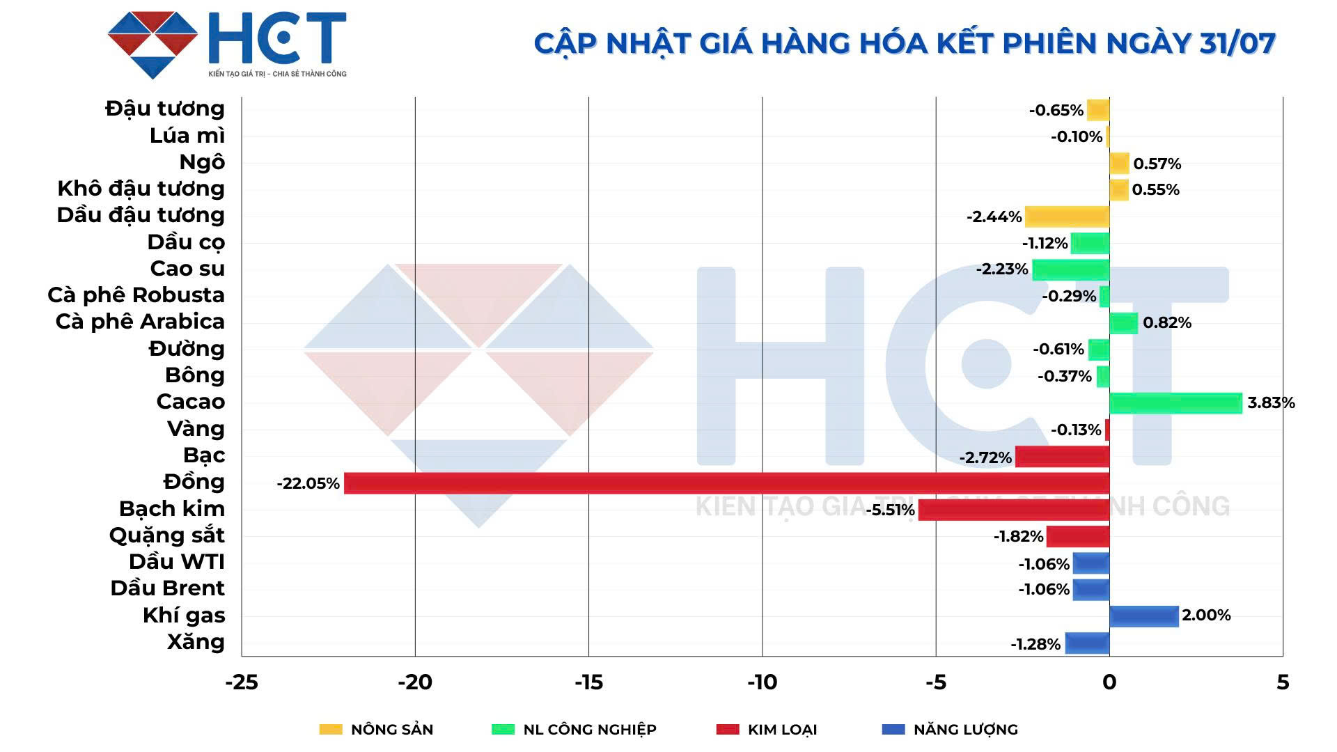 Kết thúc phiên giao dịch ngày 31/7/2025, hầu hết các mặt hàng đều ghi nhận giảm giá do những lo ngại về mức thuế quan mới của Mỹ áp lên các quốc gia. Trong đó, hợp đồng đồng COMEX ghi nhận mức giảm lớn lên đến hơn 22%.
