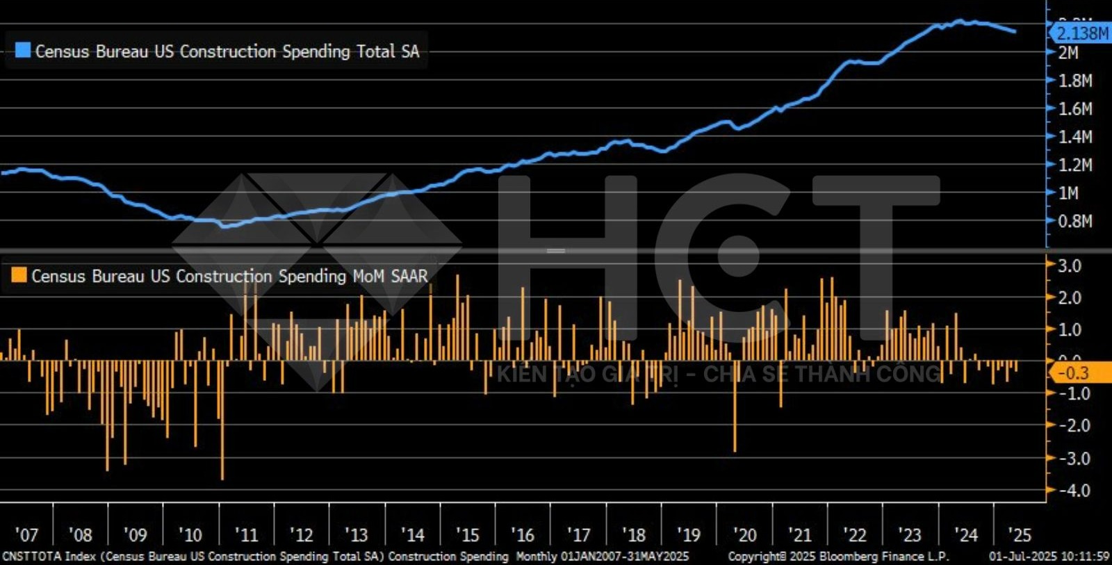 Chi tiêu xây dựng trong tháng 5 tại Mỹ giảm -0.3% MoM, thấp hơn mức giảm -0.2% dự báo và bằng với tháng trước