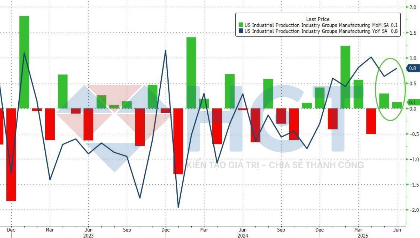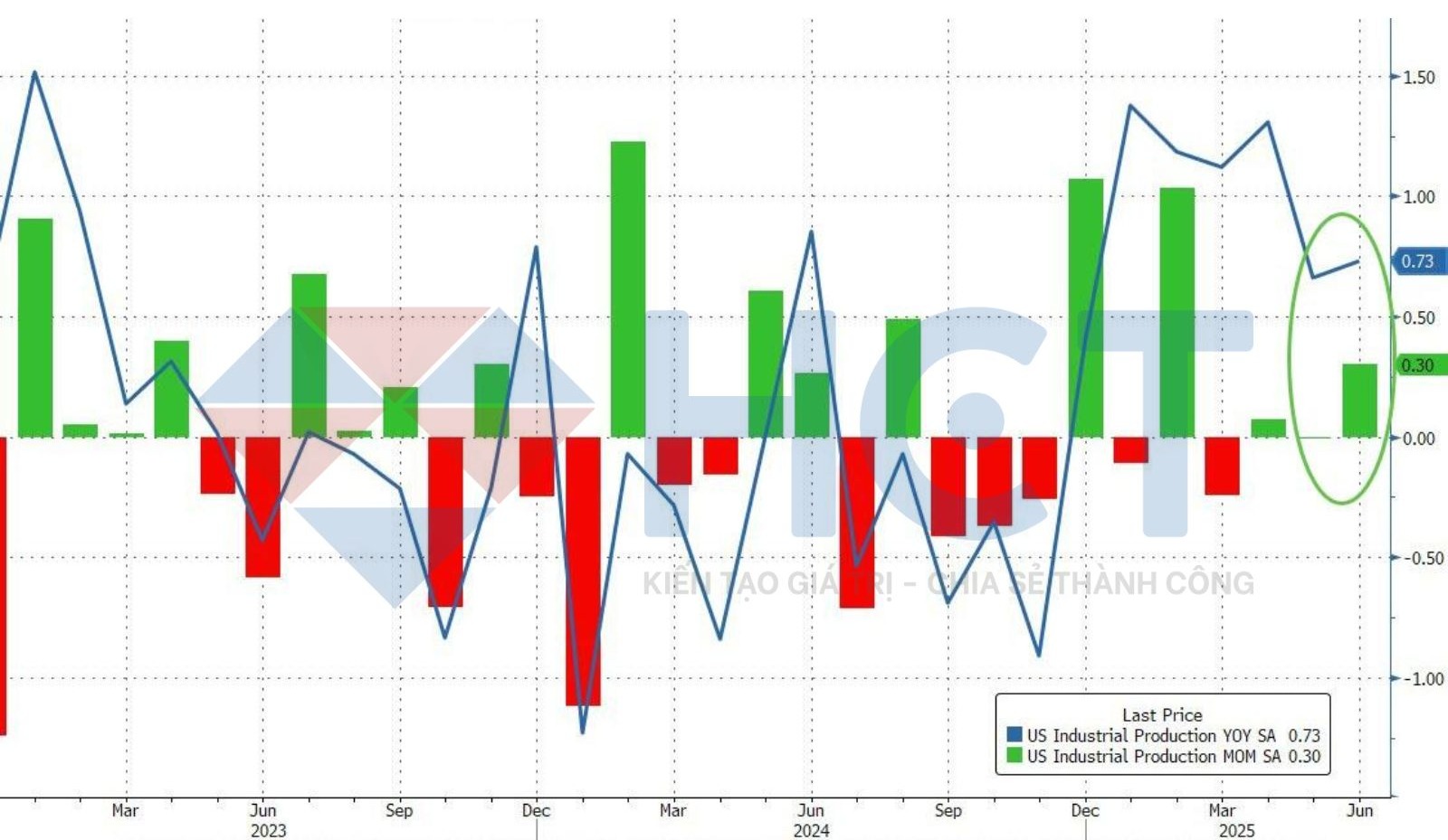 Sản lượng công nghiệp Mỹ tăng mạnh +0.3% MoM trong tháng 6, hơn dự kiến +0.1% MoM, tăng +0.73% theo năm