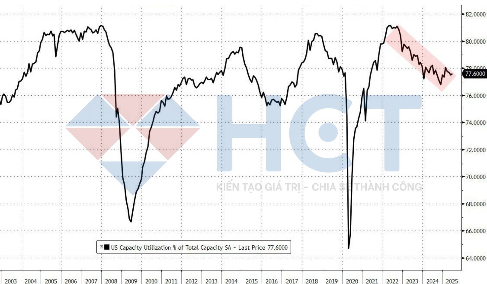 Công suất công nghiệp tăng nhẹ 77.4% → 77.6%, vẫn trong xu hướng giảm nhưng cải thiện