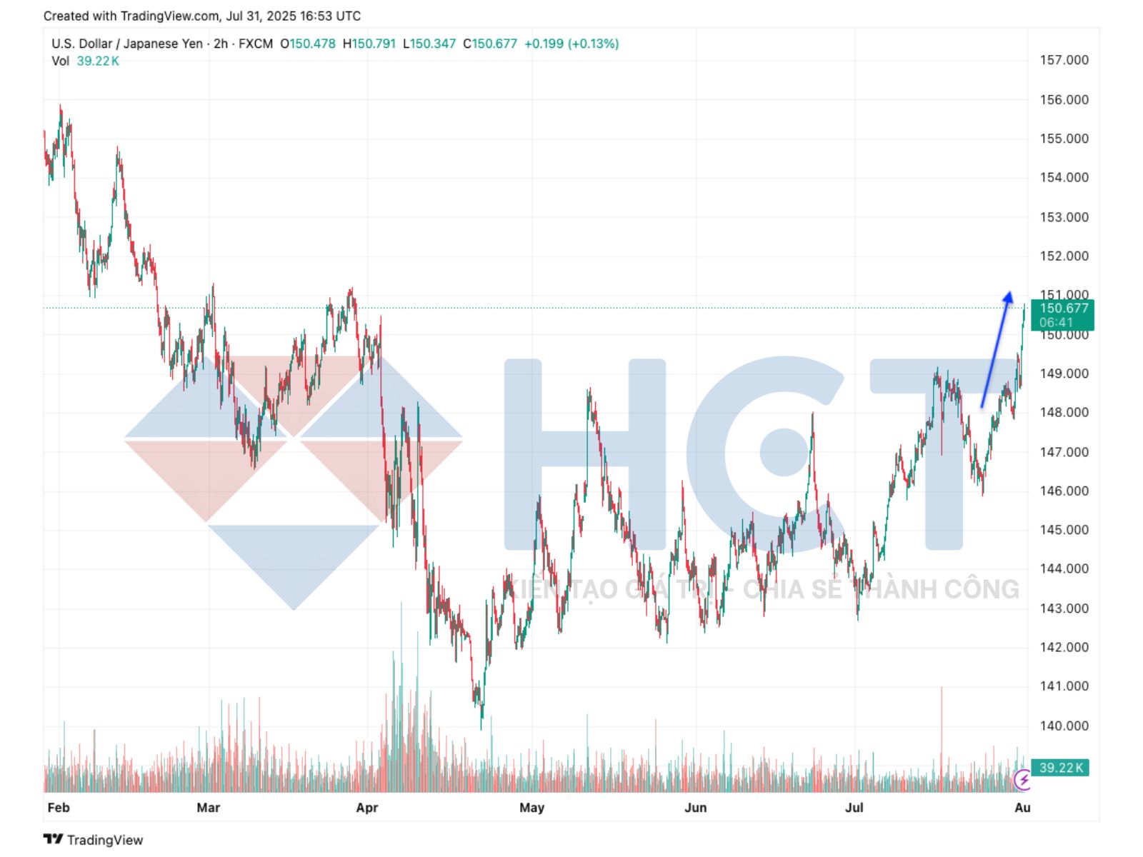 Tỷ giá USD/JPY tăng mạnh sau thông báo. USD/JPY > 150 về bằng trước giai đoạn chiến tranh thương mại