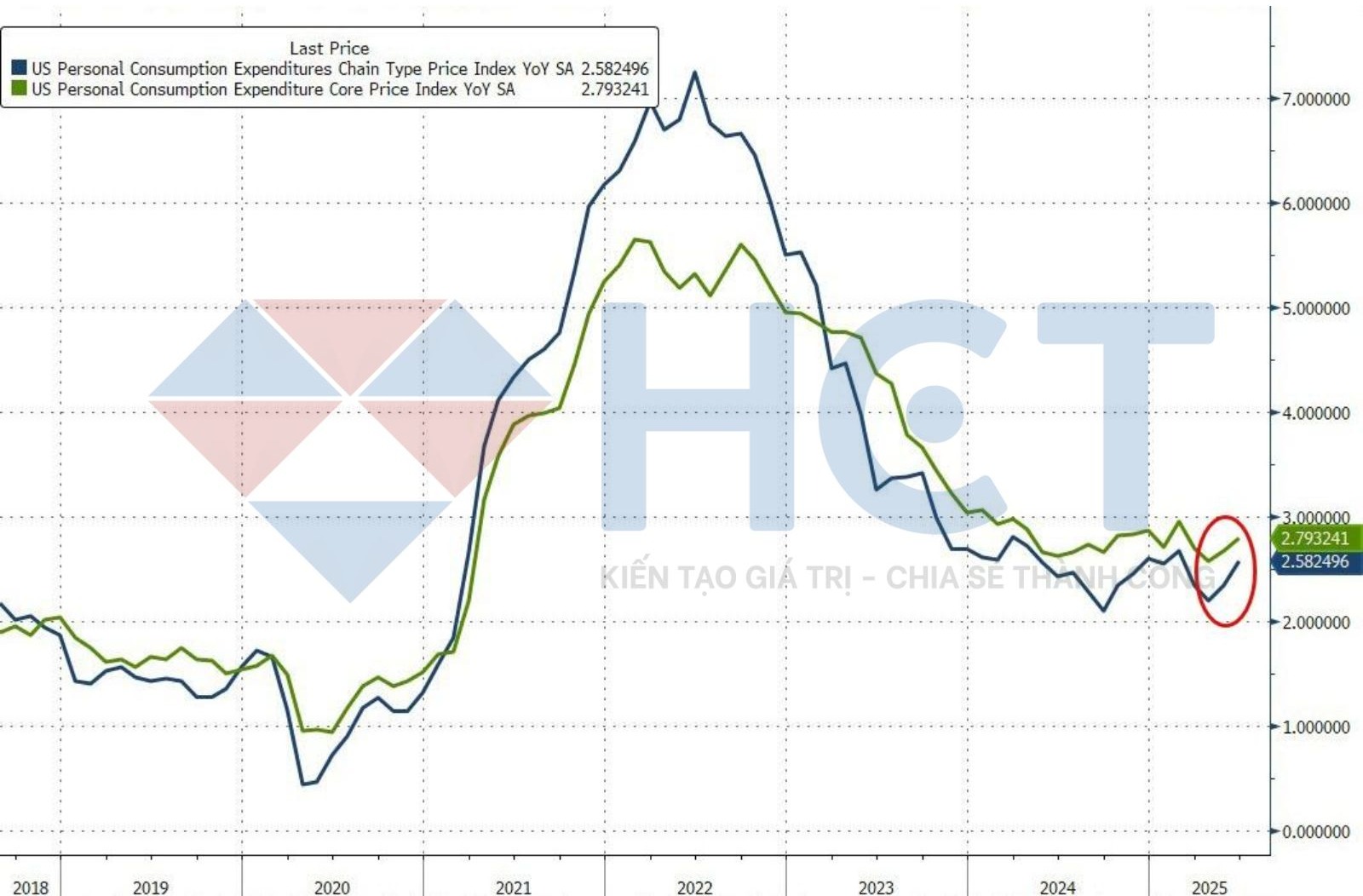 PCE cốt lõi +2.8% YoY, cao hơn mức dự báo +2.7% YoY. Tính theo tháng, PCE +0.3% MoM như mức dự kiến, tăng nhẹ từ mức tăng +0.2% của tháng trước