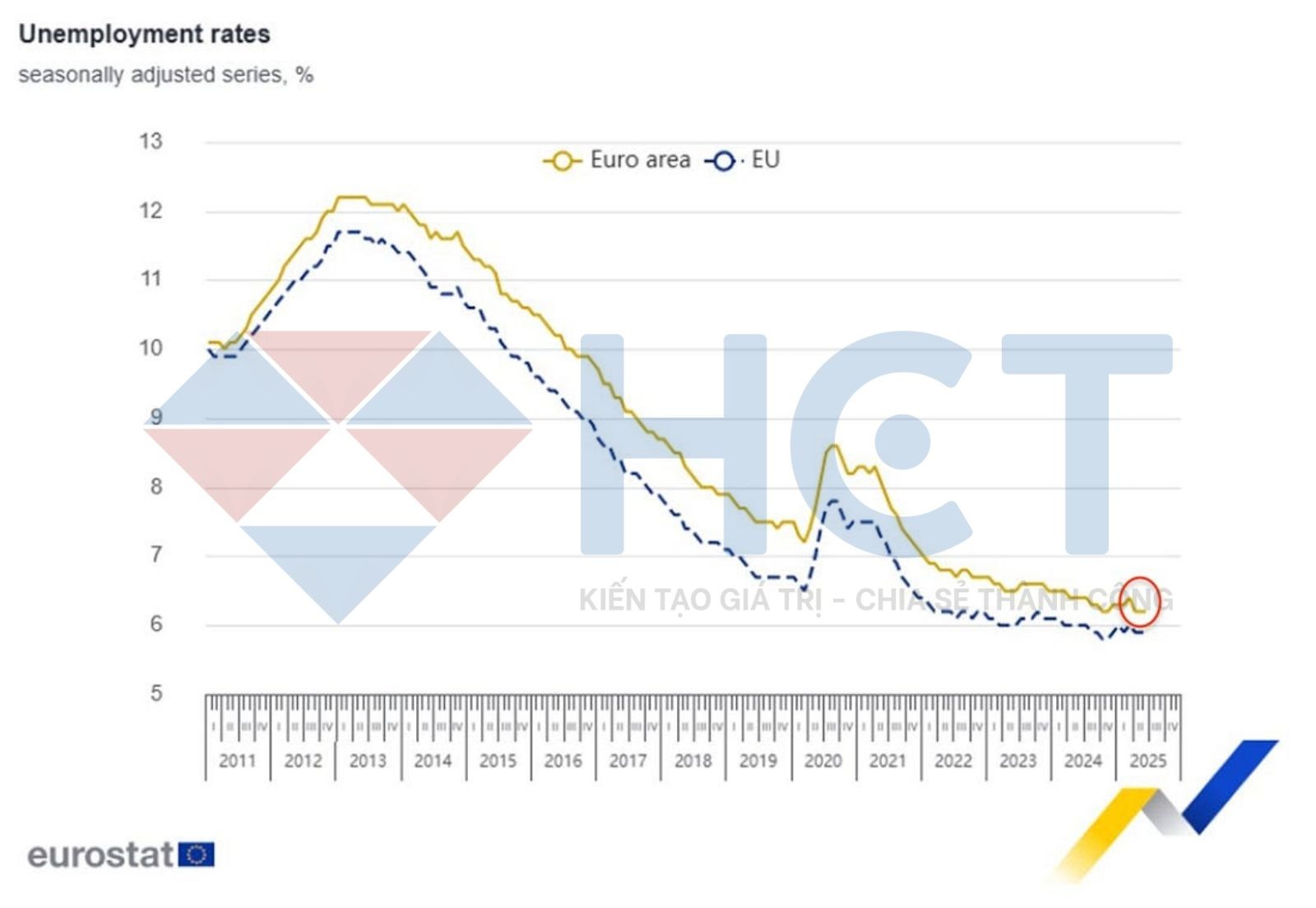 Tỷ lệ thất nghiệp tháng 6 tại Eurozone duy trì ở 6.2% thấp hơn 6.3% dự kiến, tháng 5 sửa đổi 6.3%→ 6.2%